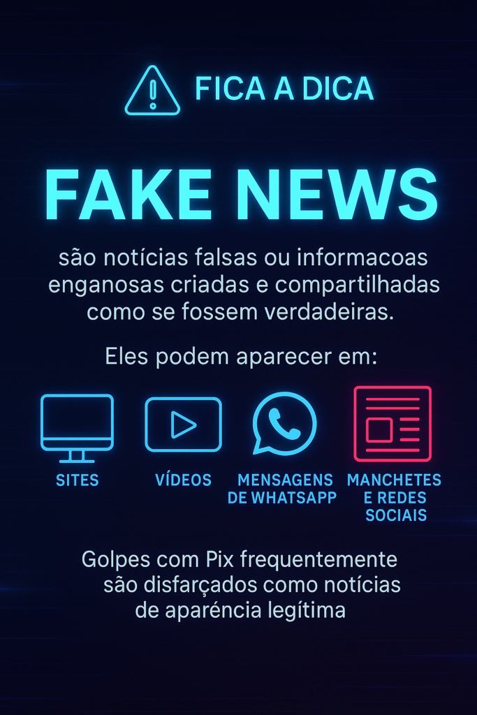 Fake news são notícias falsas ou informações enganosas criadas e compartilhadas como se fossem verdadeiras. Elas podem aparecer em sites, vídeos, mensagens de WhatsApp, redes sociais e até em manchetes de jornais digitais.